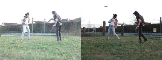Durch backsteindicke Brillengläser fixieren sich die Todfeinde. Dann wird geschossen. Die Bananen rauchen. Joe fällt. |