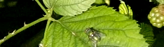 "CIMG1595_Fliege_HS1200.mov"Please respect the copyright of the author! Story/Action The fly is sitting motionless on the blackberry leaf. Suddenly, it starts to oscillate it's wings, and becomes airborne already after the first or second complete flap (Notice the difference of agility as compared to the bumblebee, above!). During this period, it re-arranges it's legs from standing to in-flight position pointing backward. One complete flap of wings takes 5-6 frames, equating to 4.5 milliseconds per flap, or a frequency of 218 Hz.